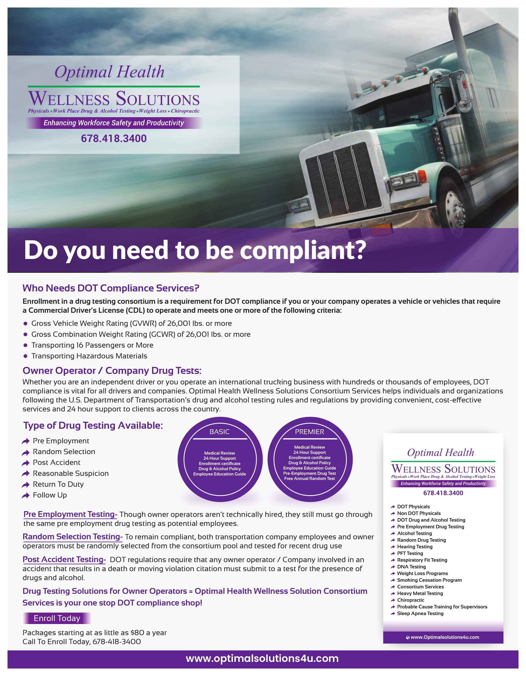 • Affordable random drug & alcohol testing consortium programs for all size companies (Owner-Operators to Large Fleets)